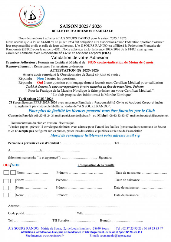 Bulletin d'adhésion Familiale saison 2025/2026